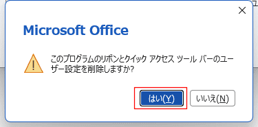 - 確認のメッセージ「このプログラムのリボンとクイックアクセス ツールバーのユーザー設定を削除しますか?」が表示されます。