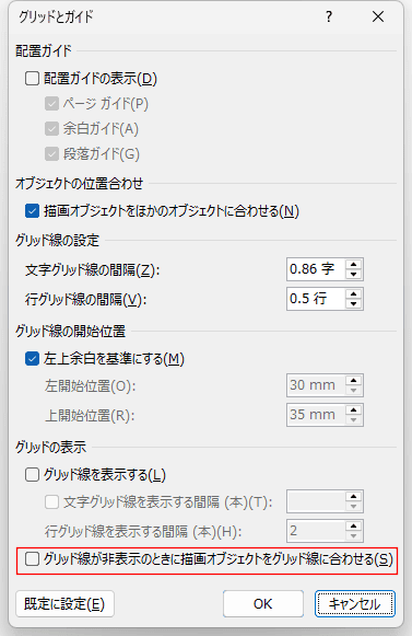 「グリッド線が非表示のときに描画オブジェクトをグリッド線に合わせる」のチェックを外します。