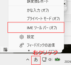 タスクバーのボタンを右クリックして、「IMEツールバー(オフ)」をクリックすると、IMEツールバーが表示されます。