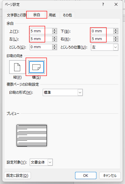 [余白]タブを選択して、印刷の向きで「横」を選択しました。