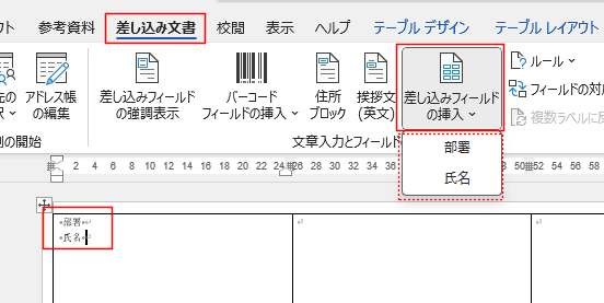 4. 差し込み文書 タブの[差し込みフィールドの挿入]ボタンをクリックして、フィールドの「部署」を挿入します。