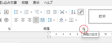 - [ホーム]タブの段落グループの右下にあるダイアログボックス起動ツールをクリックします。