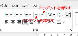 - [ホーム]タブの段落グループに「インデントを減らす」「インデントを増やす」ボタンがあります。