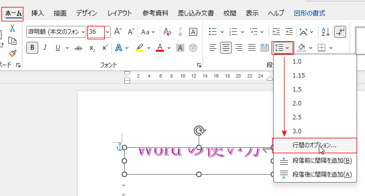 [ホーム]タブでワードアートのフォントサイズが36ポイントであるのを確認します。