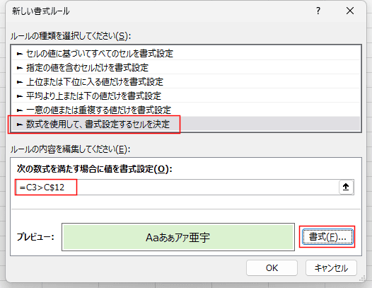 次の数式を満たす場合に値を書式設定に =C3>C$12 と入力します。