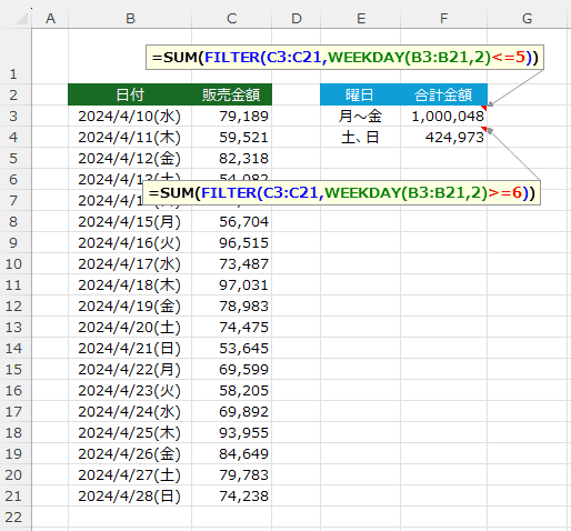 FILTER関数を使って、月〜金は =SUM(FILTER(C3:C21,WEEKDAY(B3:B21,2)<=5)) で計算します。