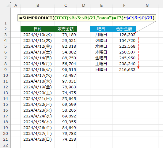 E列の曜日とを比較して、曜日が一致したら、C列の販売金額を合計するという仕組みになっています。